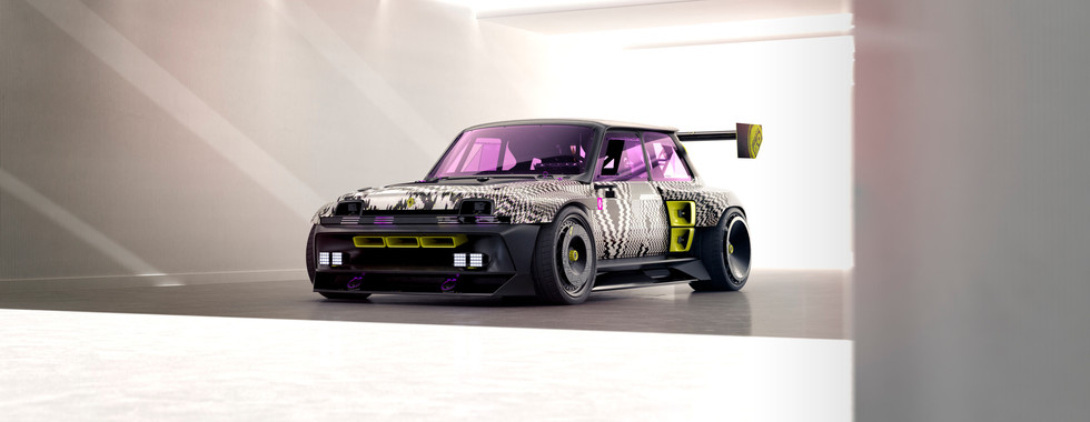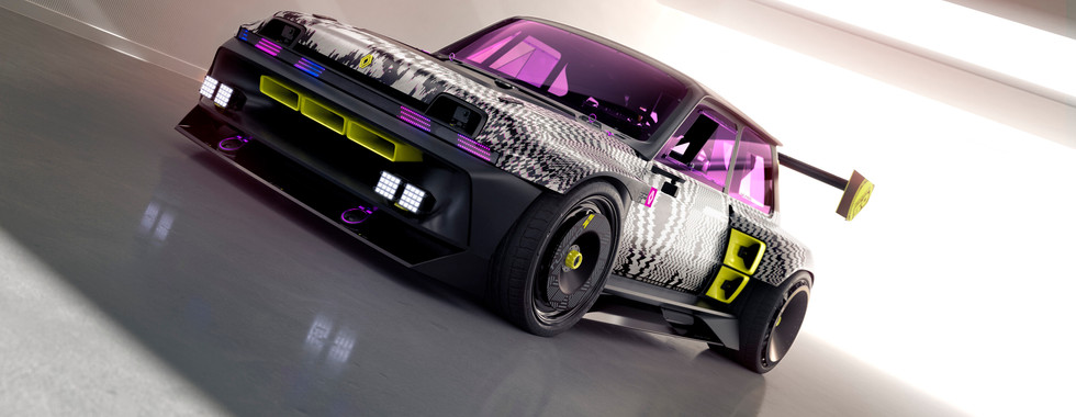 Angelehnt ist der Renault 5 Turbo 3E primär an den legendären Renault 5 Turbo 2, auch bekannt als Backenturbo. Mit den großen Lufteinlässen, die im 2022er-Concept für die Kühlung der Antriebskomponenten zuständig sind, oder den vier quadratischen Nebelscheinwerfern, in denen jeweils 16 LEDs für maximale Lichtausbeute sorgen, wird der Klassiker aus den Achtzigerjahren zitiert. Aber auch Videospiele von damals haben Einfluss - das zeigen beispielsweise die vorne und hinten pinkfarbenen, blauen und gelben LED-Streifen, die bei Drifteinlagen blinken, und die Tarnfolie an der Karosserie.